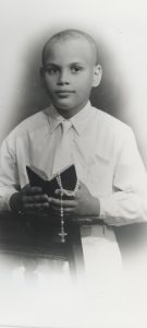 Then my mother drove me to a photo studio to immortalized the occasion. The photo shop close to the cathedral, was at the intersection of rue des Miracles and rue Monseigneur Guilloux. The place seemed as ancient as photography itself. Its window, adorned with a mosaic of portraits, hinted at the photographer’s versatility and his likely alliance with the Frères for capturing the pivotal moments of First Communion. My mother’s choice to bring me there, over the more renowned Chaton studio, was perhaps not coincidental but a deliberate nod to tradition.